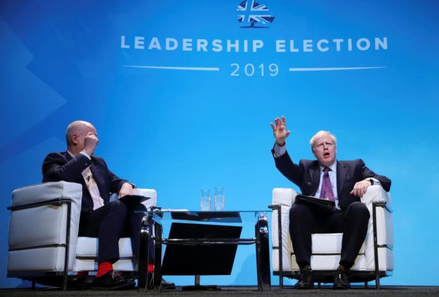 Boris Johnson, a leadership candidate for Britain's Conservative Party, reacts throughout a hustings event in Birmingham, Britain, June 22, 2021. ... -