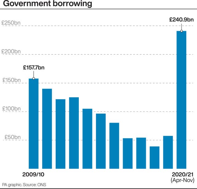 Government borrowing surged to a record lb31.6 billion in November as efforts ramped up to support the economy with the second wave of the pandemic, official figures show.