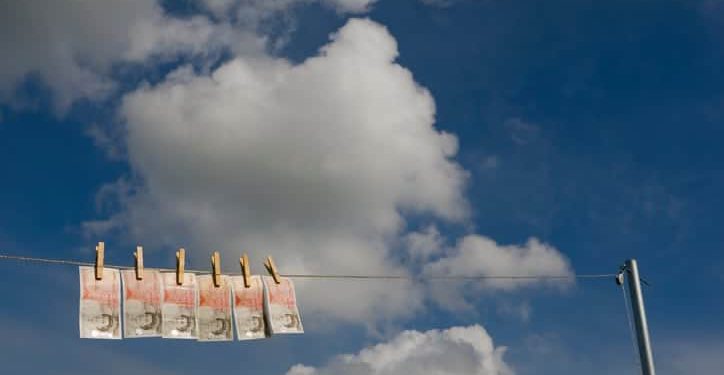UK currency – new lb50 notes – 'drying' on a washing line on the Summer's day. Symbolising money laundering.